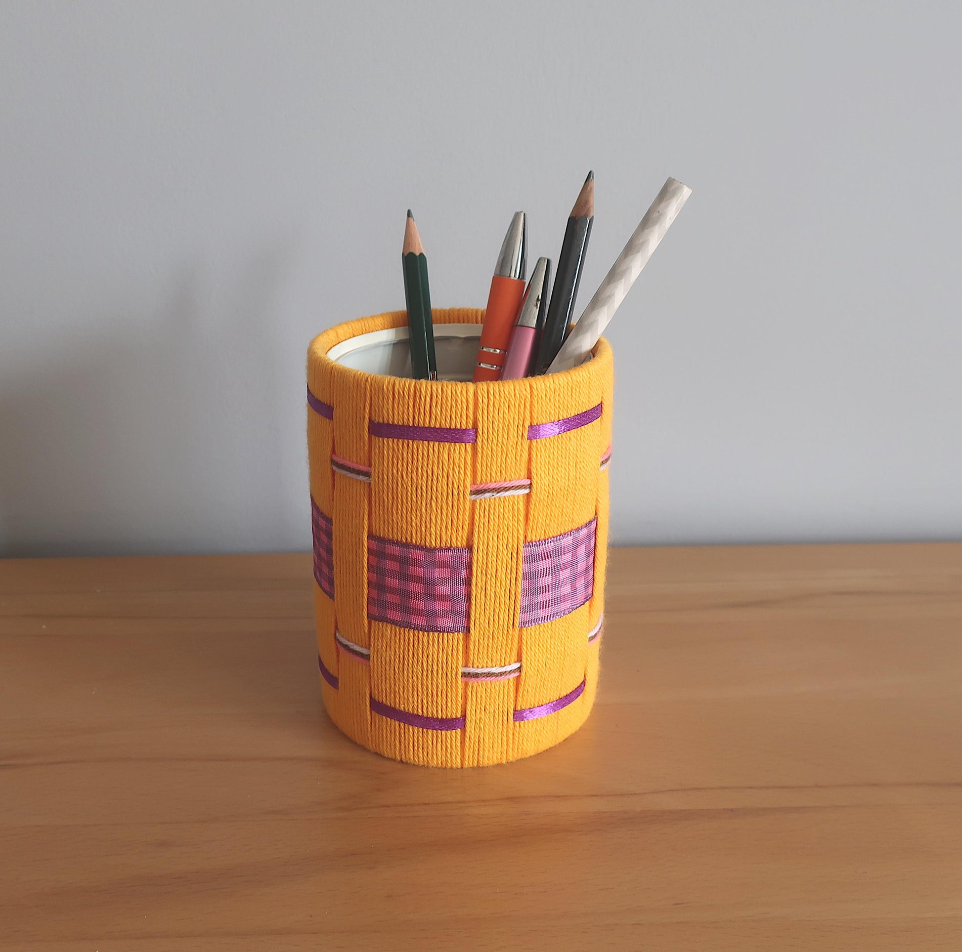 Für diesen Stifthalter habe ich Baumwollgarn und Schleifenband um einen Plastikstreifen gewickelt und diesen dann über eine alte Konservendose gestülpt habe. Weiße Sprühfarbe lässt die alte Dose schick aussehen. Dieser Stifthalter ist ein Unikat und wir genau so nicht noch einmal gefertigt.