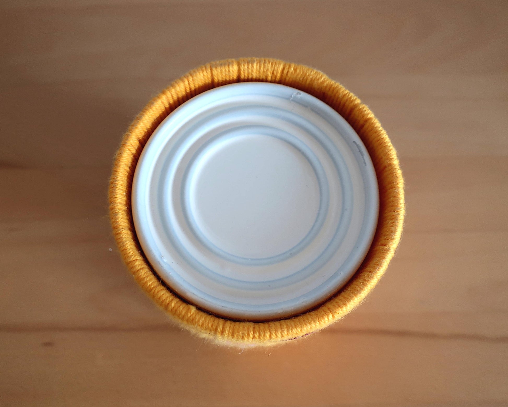 Materialien: Konservendose, Baumwollgarn, Schleifenband, Sprühfarbe